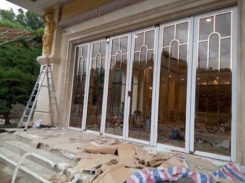 2、配玻璃夾的:把不銹鋼地彈簧門上的玻璃上夾和下夾的不銹鋼面蓋拿開,把地彈簧玻璃門打開到90度的定位角度上,用東西墊著拉手開門端的下角,一個人扶著門,另一個人用6角匙把門的上下門夾上的固定軸套的螺絲擰開,拿下軸套就可以把門拿下來了。